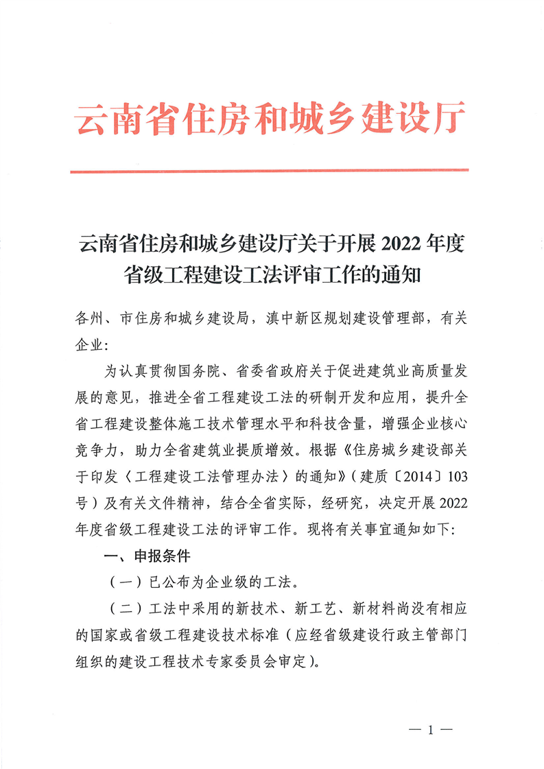 云南省住房和城鄉(xiāng)建設(shè)廳關(guān)于開展2022年度省級(jí)工程建設(shè)工法評(píng)審工作的通知